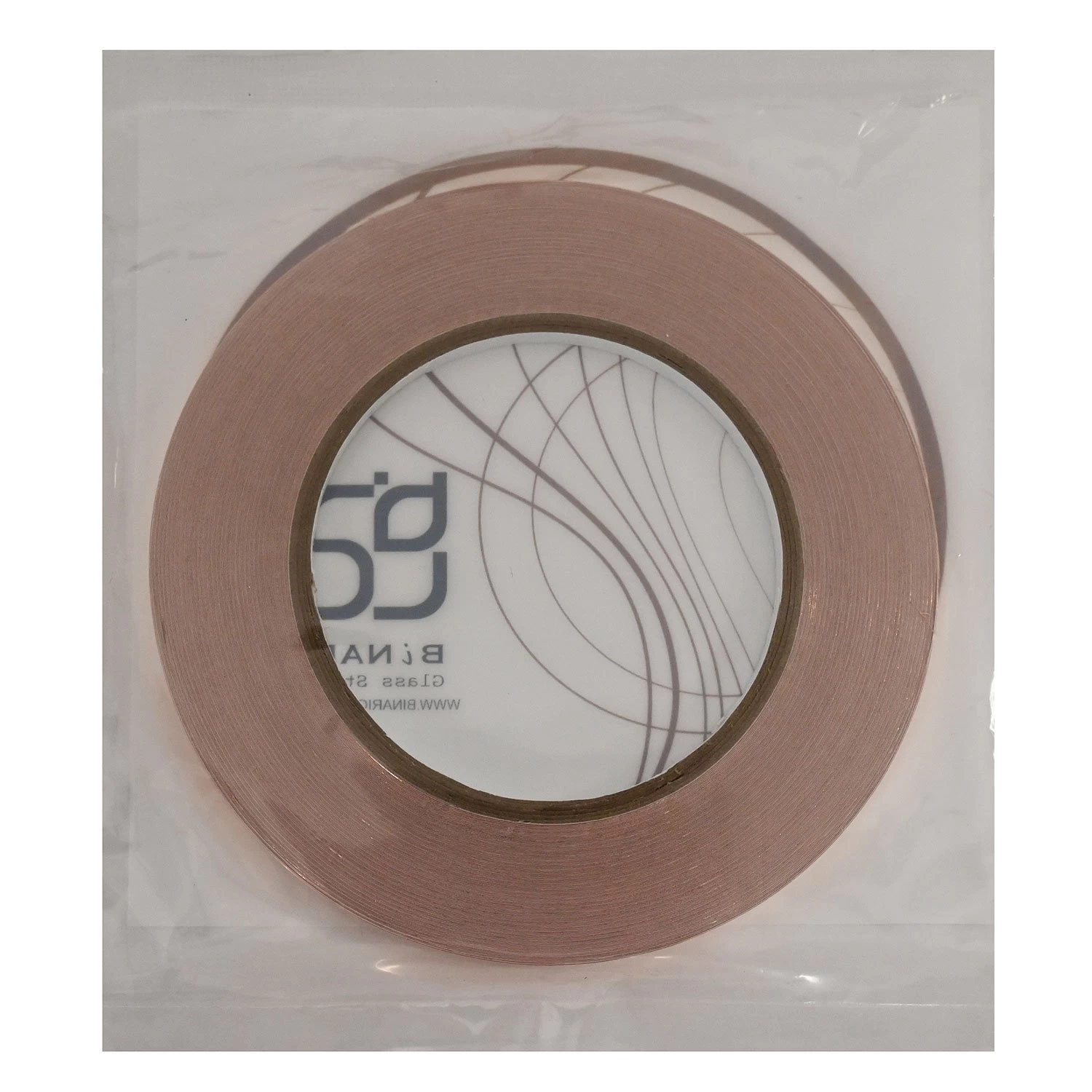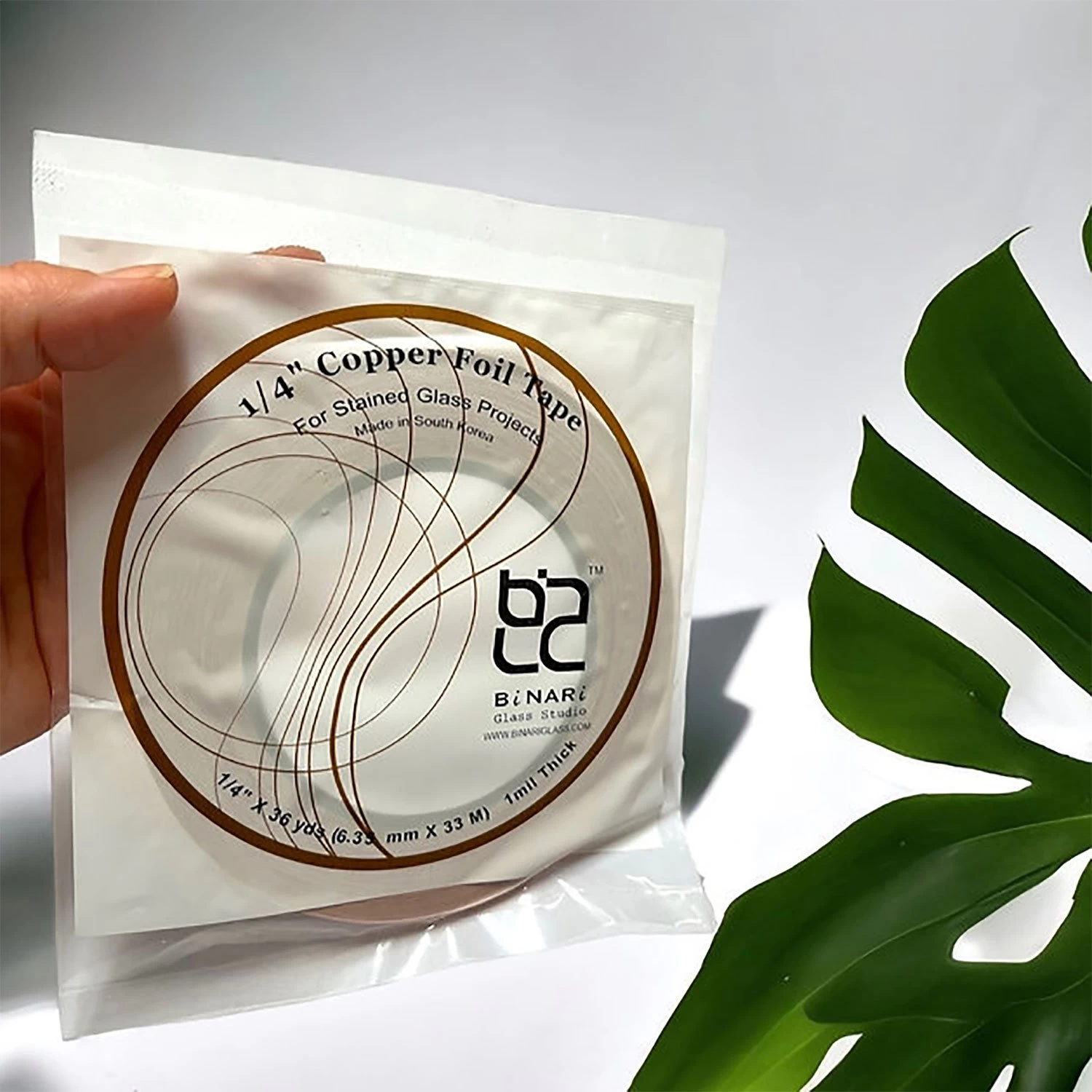 Specially made in South Korea, BiNARi Glass Studio® Copper Foil Tape is new, innovatively lightweight, and artist-friendly. It features durable tack with strong heat-resistant adhesive, making it the excellent choice for producing a smooth, uniform solder bead for stained glass projects. Copper backed foil is ideal for projects using opalescent glass or for projects where copper patina will be used. Foil measures 1/4″ wide and 1.0mm thick. Sold in a 108 foot roll.Â