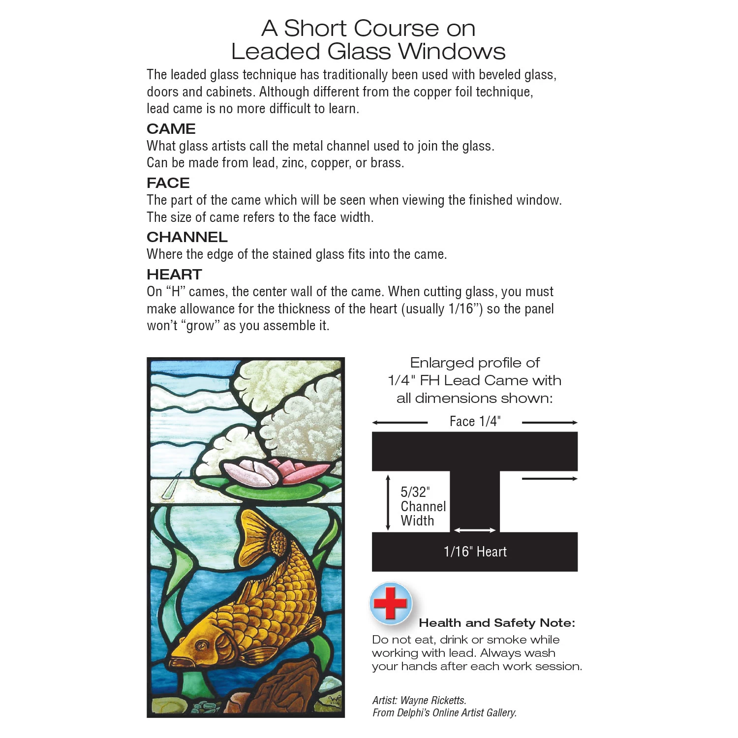 Flat H lead came provides an authentic touch on traditional or Victorian stained glass panel designs. Pieces measure six feet long with a 3/16″ channel. Face measures 1/4″.