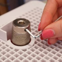 60 diamond mesh grit and 1″ diameter. Use it to quickly and aggressively grind away at the glass. Bits fit most glass grinders.