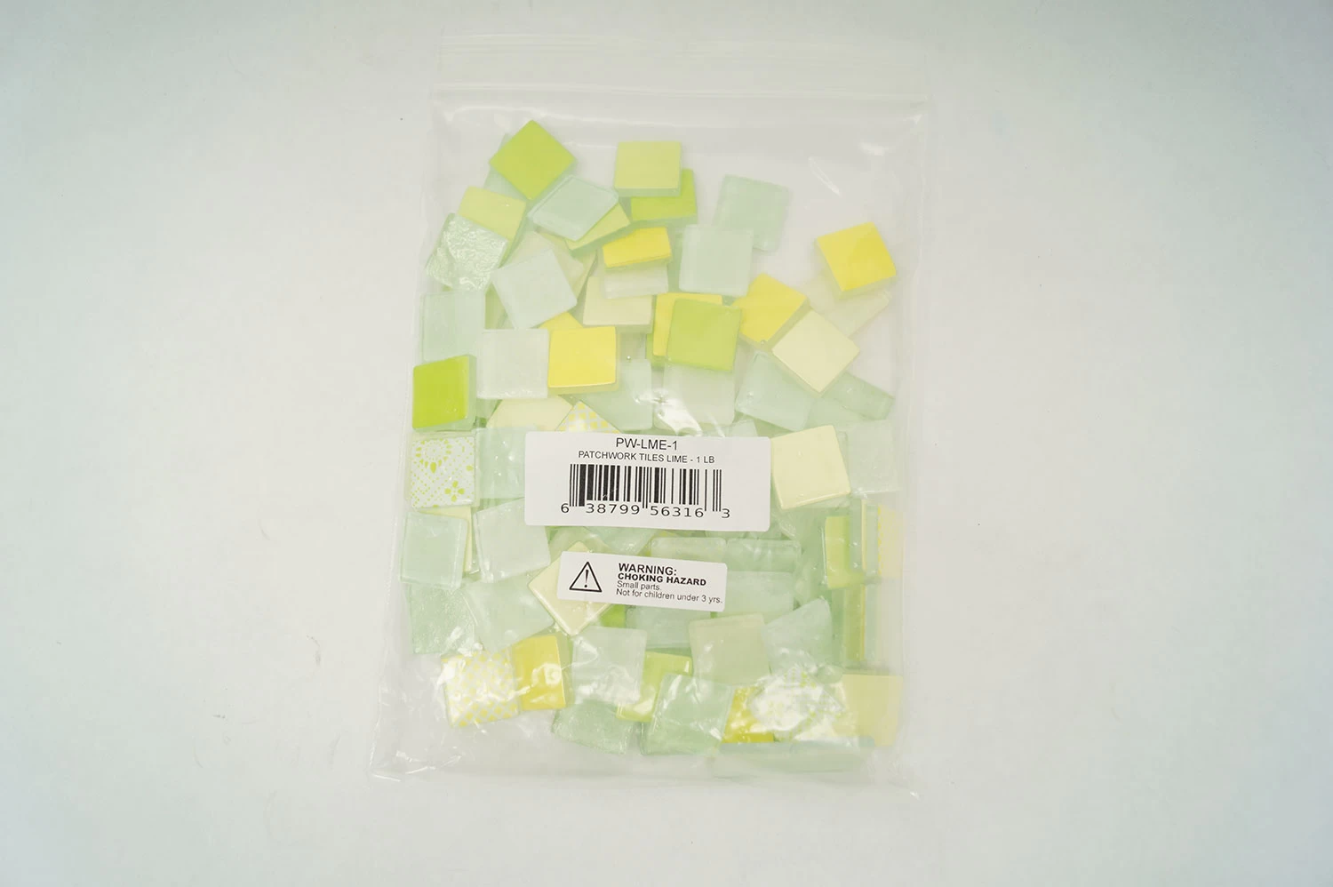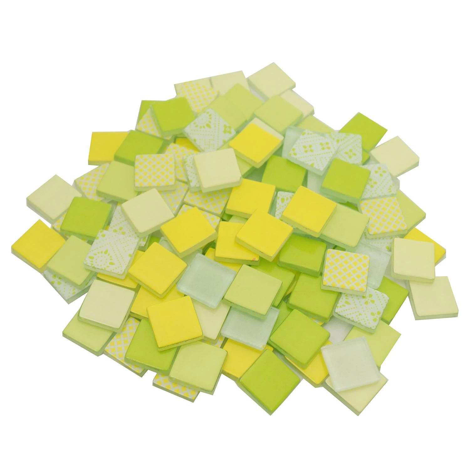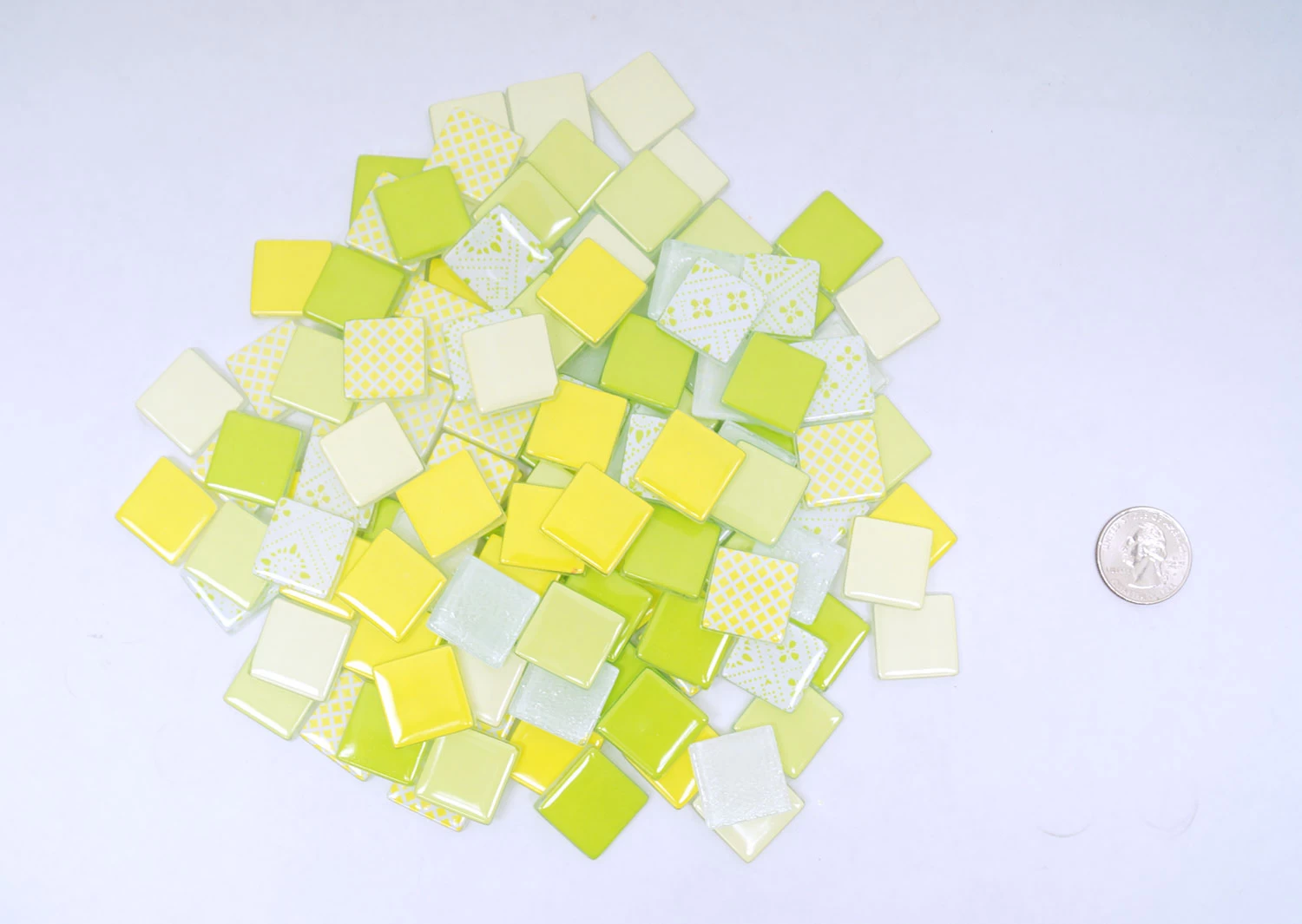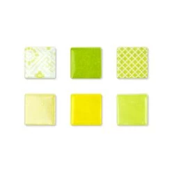 Create stunning mosaics with the fun lemon and lime tile assortment. These 3/4″ tiles feature soft rounded edges and corners. Durable, this tile does not readily chip or crack but can be easily nipped using wheeled nippers #2039. Tiles measure approximately 3/4″ x 3/4″ square. About 115 tiles. Covers 82 sq inches. Sold in a 1 lb (16 oz) package.Â