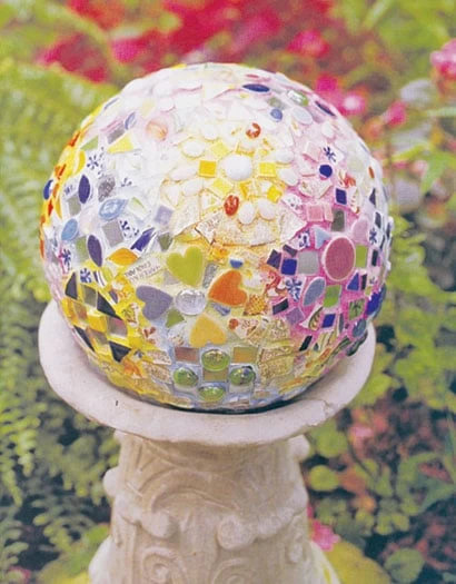 Mosaic gazing ball by artist Connie Sheerin. Wine table top created by artist Melanie Ellis.Â