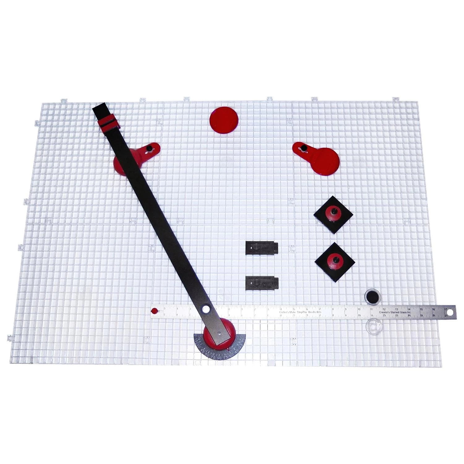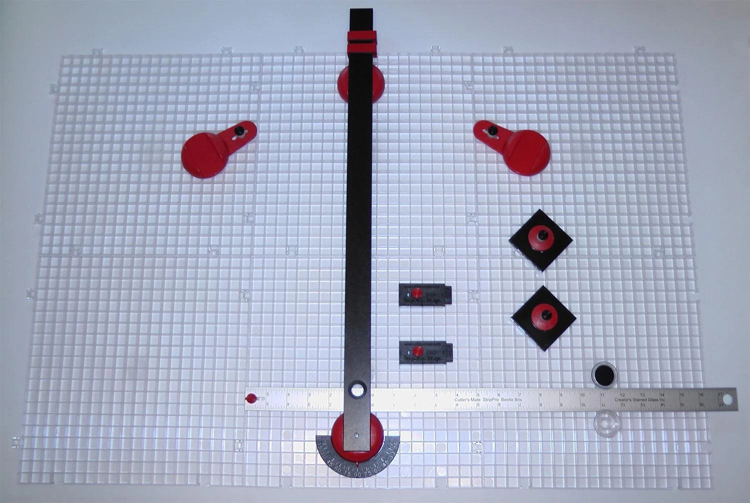 Designed with simplicity and comfort in mind, this cutting system helps you score glass faster and easier than ever before. The Beetle Bits Cutting System offers a quick compass guide for all the most popular shapes and angles, easy-adjust stops for non-slip positioning, and adjustable angle rests. You can make cuts from either side of the Waffle Grid Surface #5424 (sold separately) or even make cuts perpendicular from the base ruler. Designed to work with the Flying Beetle Glass Cutter #5428 (sold separately). Get the Beetle Bits System, Beetle Glass Cutter and Waffle Grids 4-Pack with the money saving kit Complete Beetle System #5429.