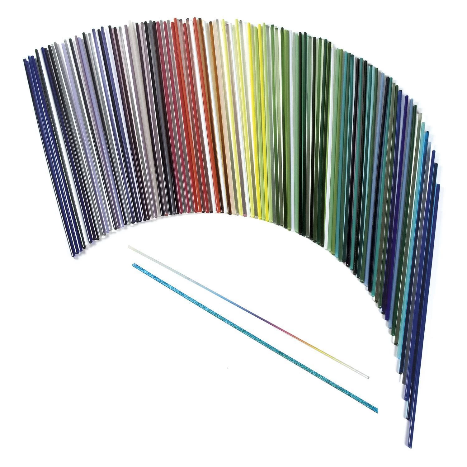 Want to experiment with rods? Pick up a Hot Rodz Starter Pack and start experimenting! This special pack contains a wide variety of Bullseye’s most popular 90 COE opalescent and transparent colors, as well as two bonus strips of dichroic Sizzle Stix. This assortment is ideal for beginning beadmakers, instructors, or anyone who wants a great variety of color! Whether you want to make striped, dotted, fish or floral beads, this pack is a great way to build up a collection of colors to suit your fancy.