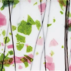 Fracture streamer glass consists of paper-thin shards of colored glass and float in curving glass threads on a white background. Excellent for background and accent pieces. Features a pretty rose garden color combination. Single-rolled “Catspaw” transparent fusibles have slightly knobby textured backs and pointillistic light transmission. Standard thickness 3mm. 90 COE.