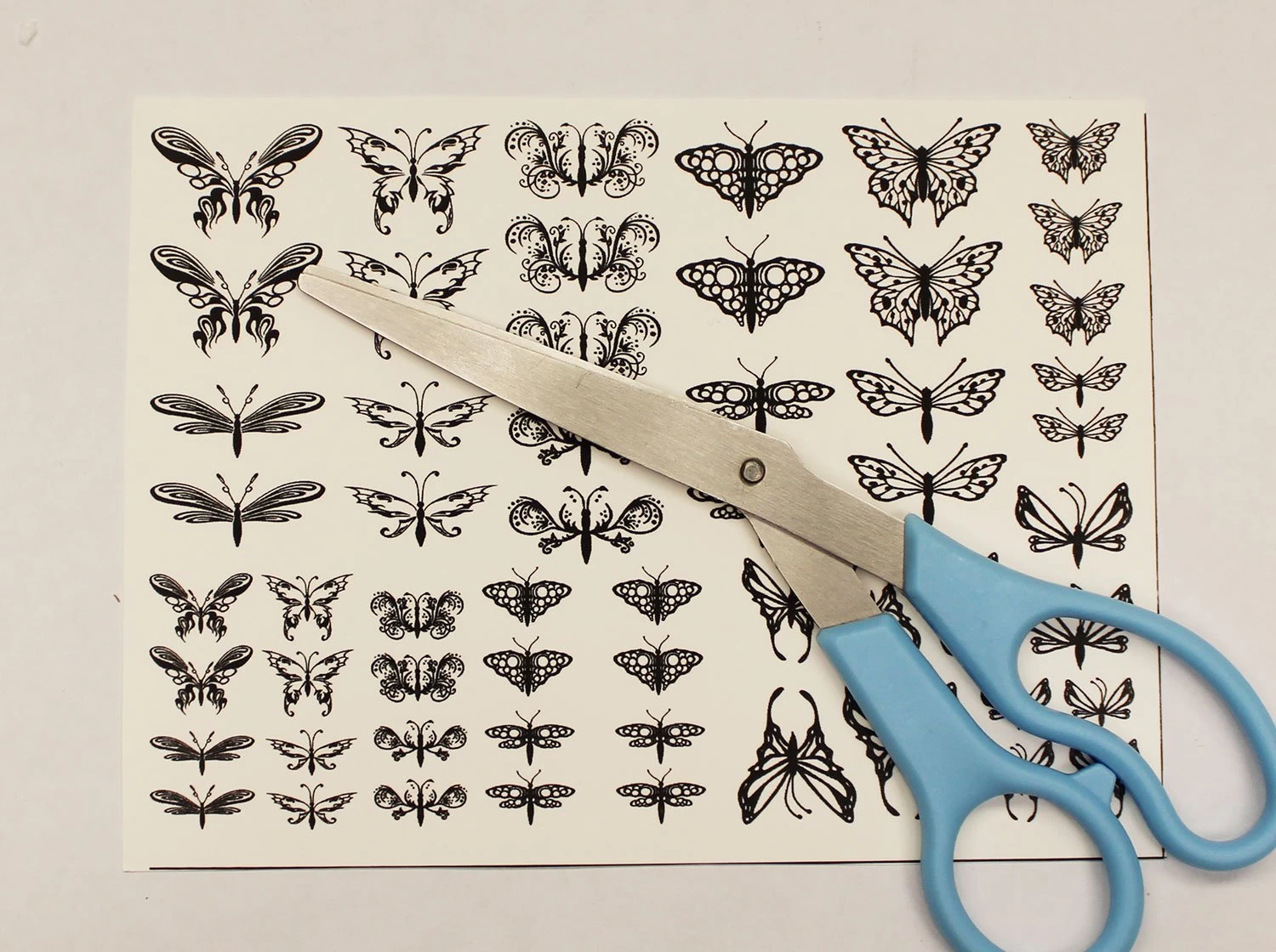 To apply, cut out the design desired, soak in warm water until loosened from backing, then slide and position on glass. Carefully smooth down to eliminate any bubbles and allow to dry completely before firing. Decals mature becoming permanent when fired to 1290° F.