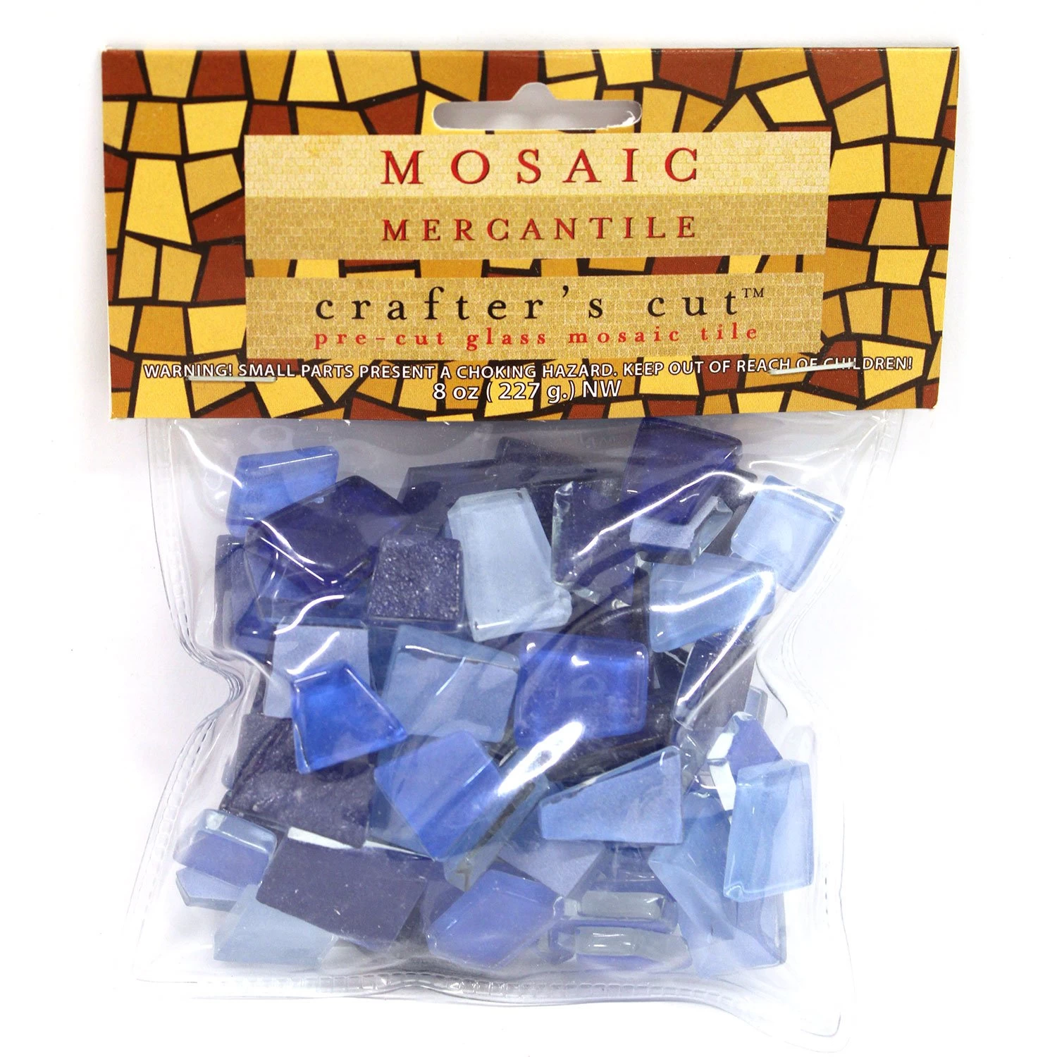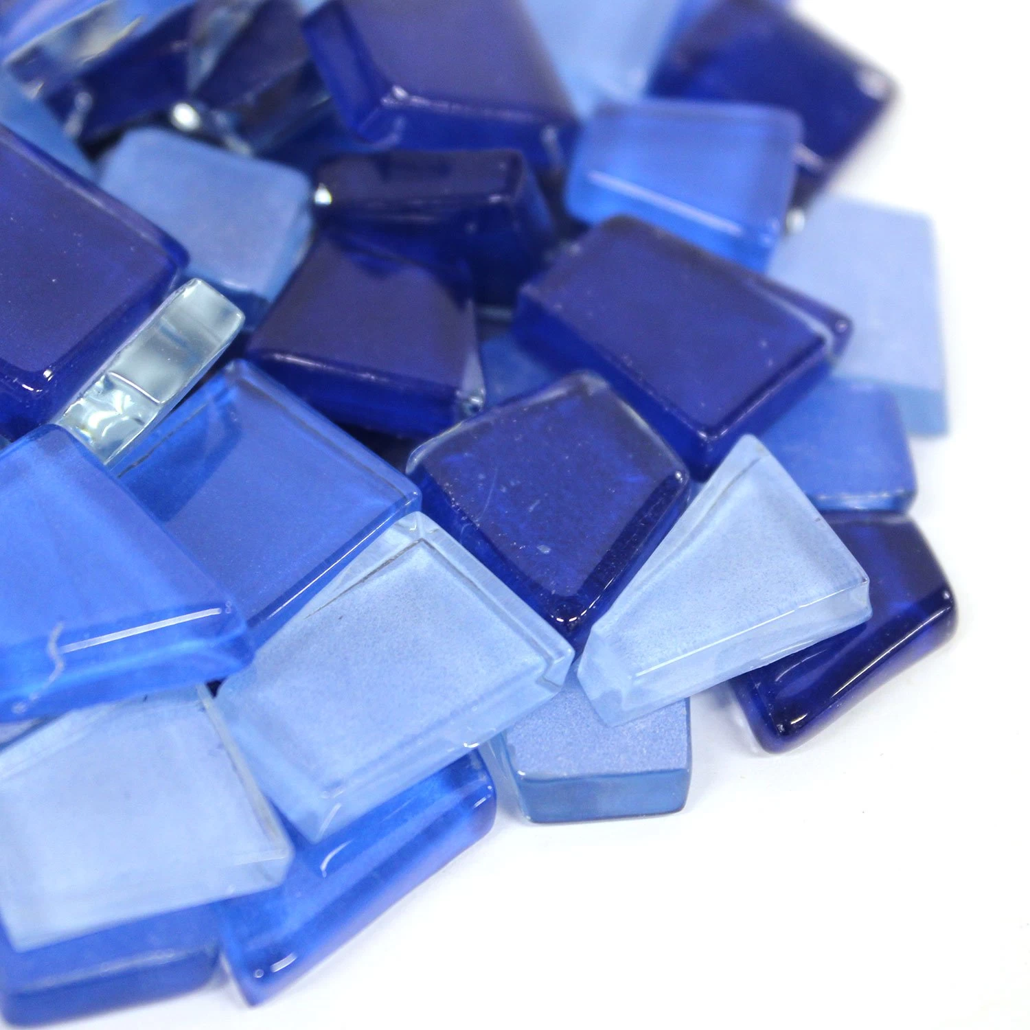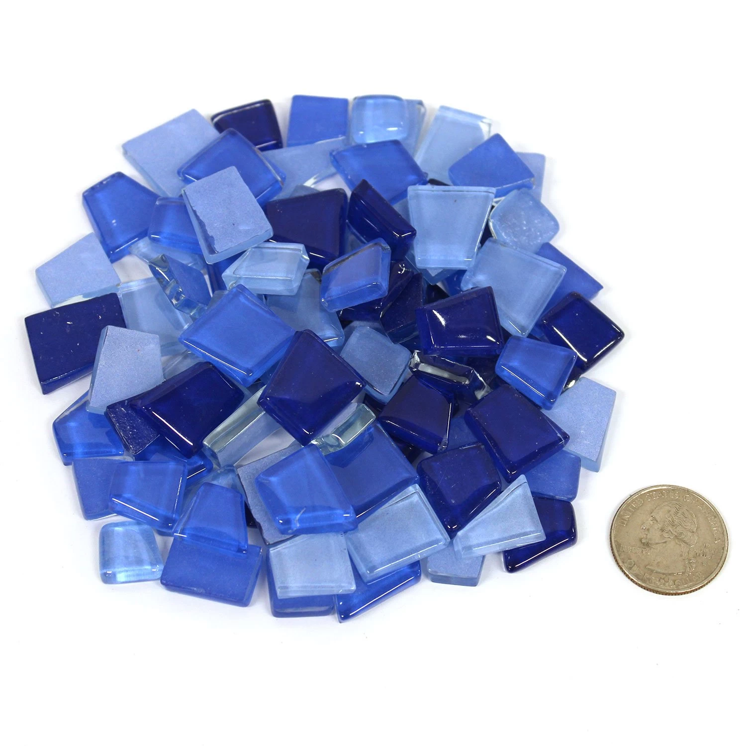Irregularly shaped blue glass mosaic tiles are designed for easy application. Hand-cut tiles feature painted backsides that allow light to pass through the tiles from the top and sides creating amazing depth. Sizes range from 3/4″ to 3/8″. 1/2 lb bags.