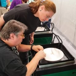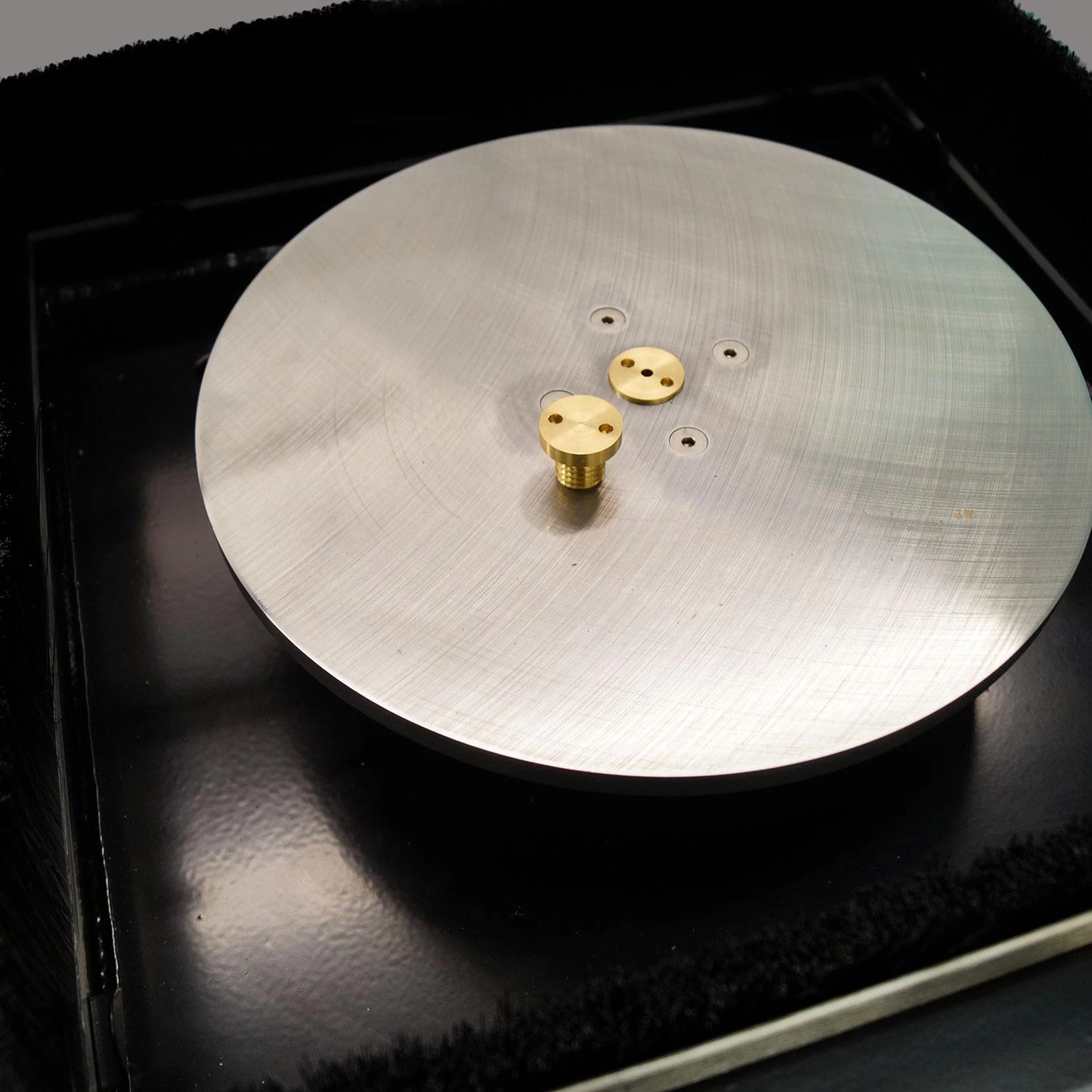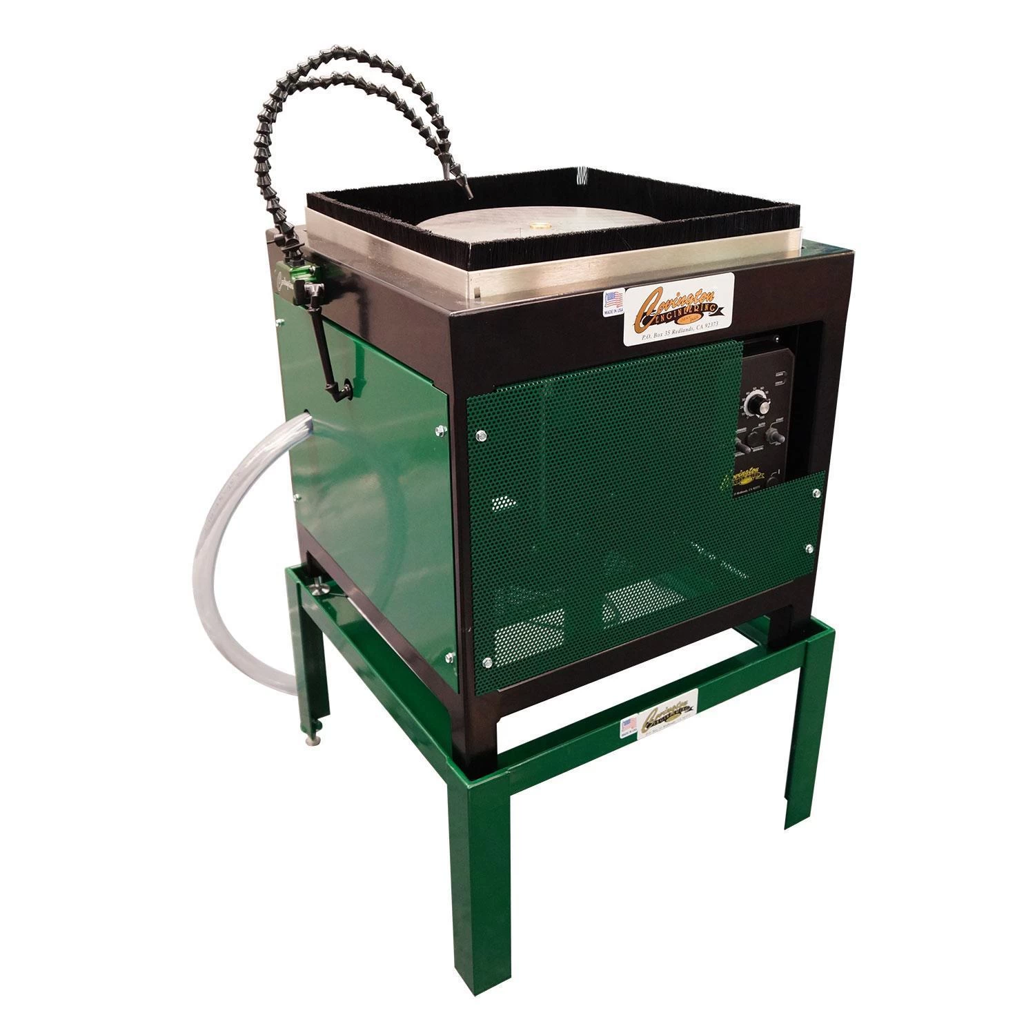 Easy to change magnetic discs allow you to progress from rough shaping to final polishing seamlessly. Designed to center over the brass center plug quickly, for fast changes, you’ll also appreciate that the brass plug remains below the disc surface. The 12″ flat plate is precision ground, then mounted to the motor shaft on bearings that are spaced 11″ apart for exceptional rigidity and stability. The female shaft accepts a variety of 5/8″-11RH male fitting diamond discs and diamond accessories. An optional double-ended male fitting is also available for female thread fitting accessories. The brush edges allow large projects to pass unobstructed while containing spray.