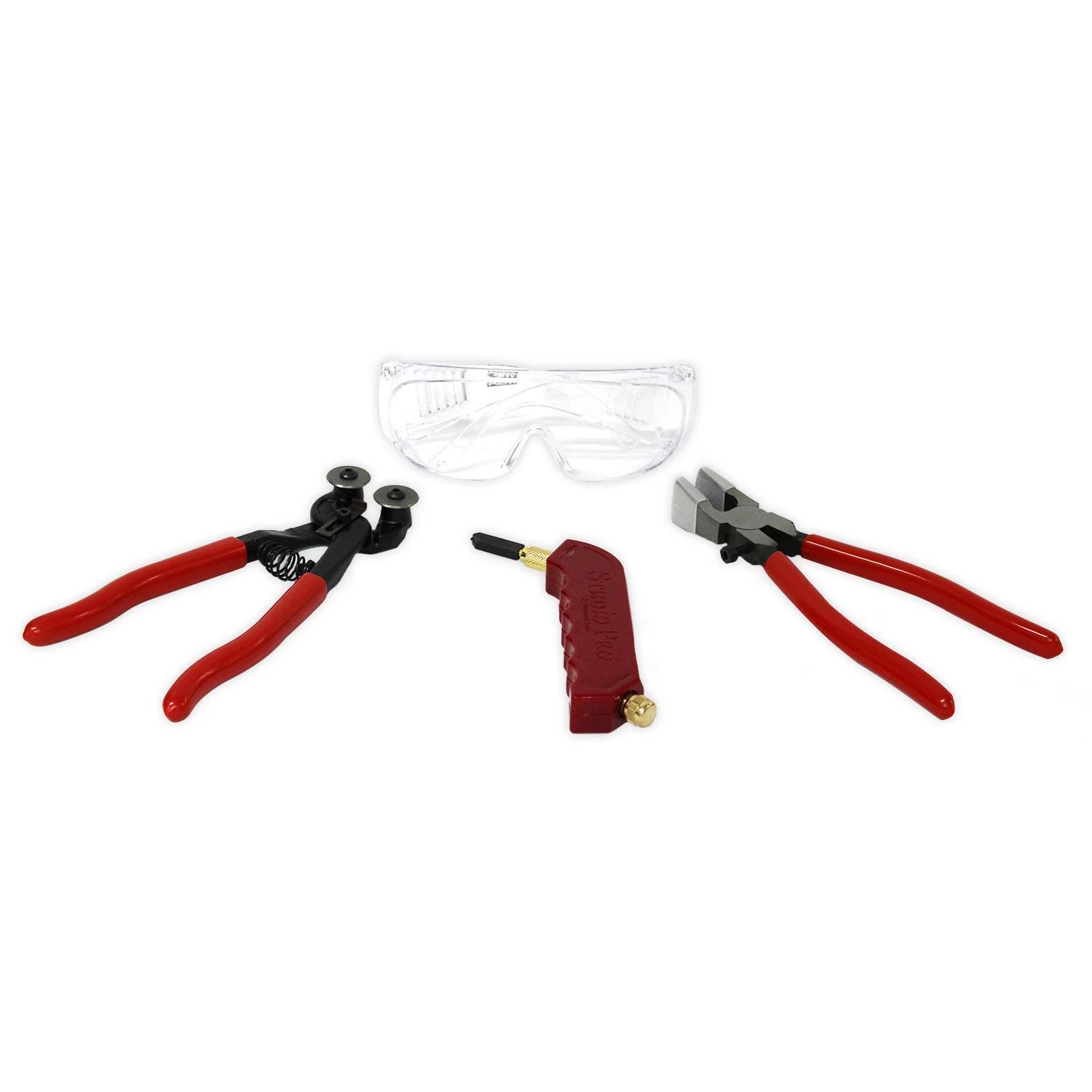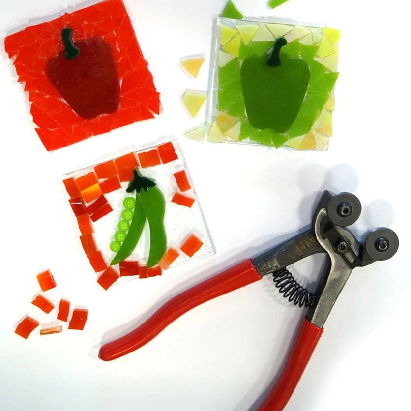 Works well for stained glass, mirror, and glass tiles. Use the glass cutter and running pliers to cut out shapes. The nippers are an excellent time-save tool for nipping small pieces to fill in backgrounds. Kit includes safety glasses, wheeled nippers, running pliers and pistol grip glass cutter.