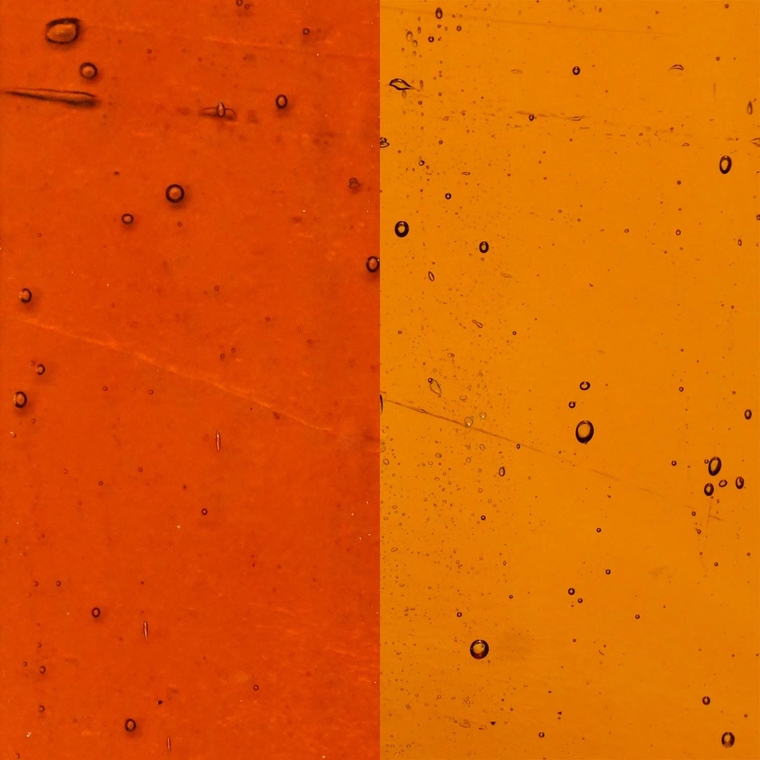 Glass swatches are a 2″ square to better show detail. Main image shows glass unlighted. Second image shows glass backlit. Third image shows both views collaged together – right side of image shows light transmission.