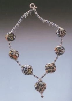 Fused glass platter by Delphi artists Melanie Churchill and Karina Foster, Polymer clay necklace by Jennifer Bezingue. From “The Art of Jewelry: Polymer Clay” book #6982. Resin coasters by Marie Browning. From “Casting For Crafters” book #6985.