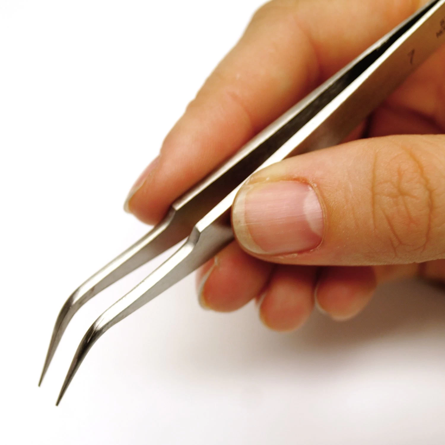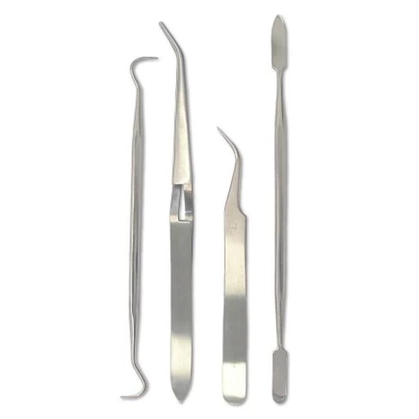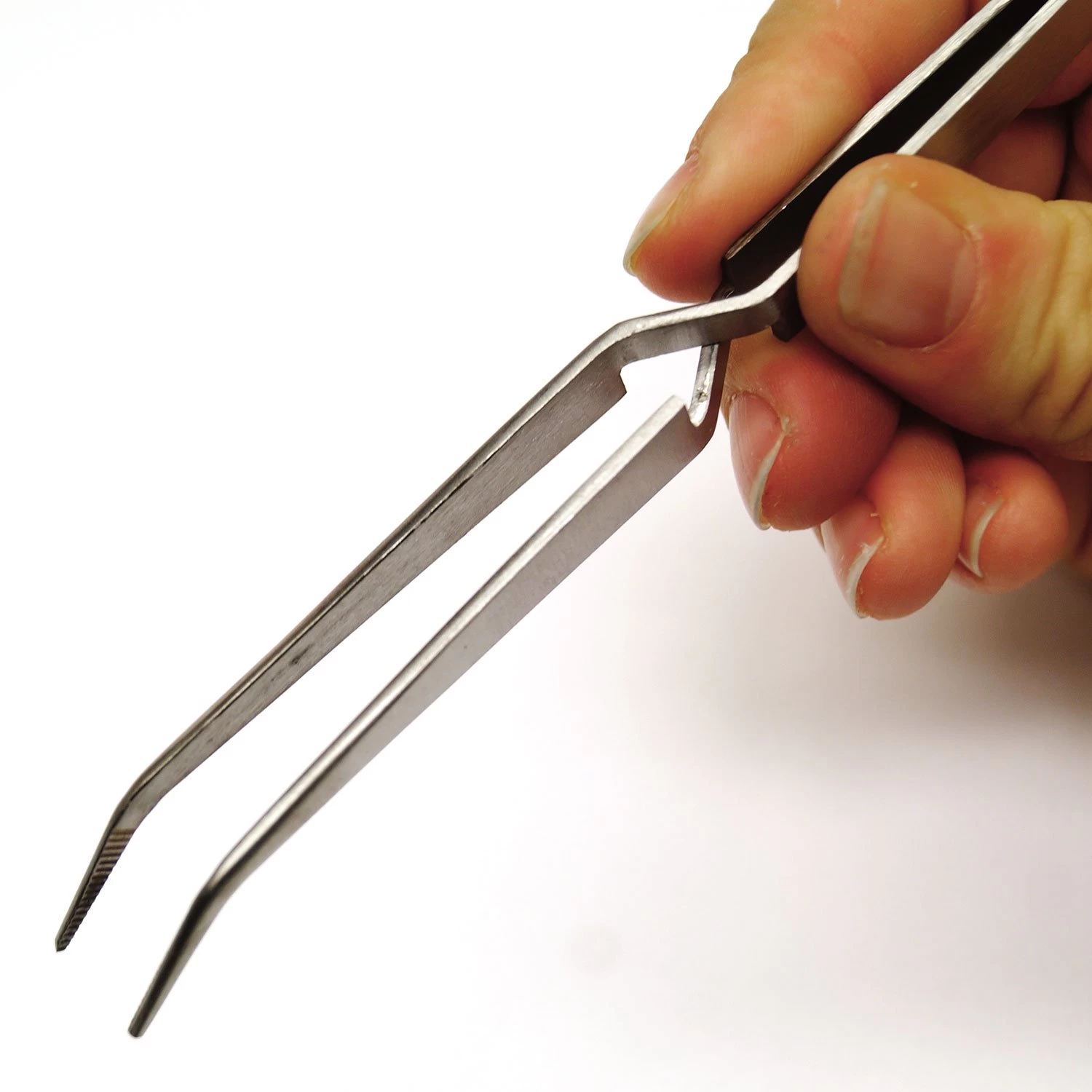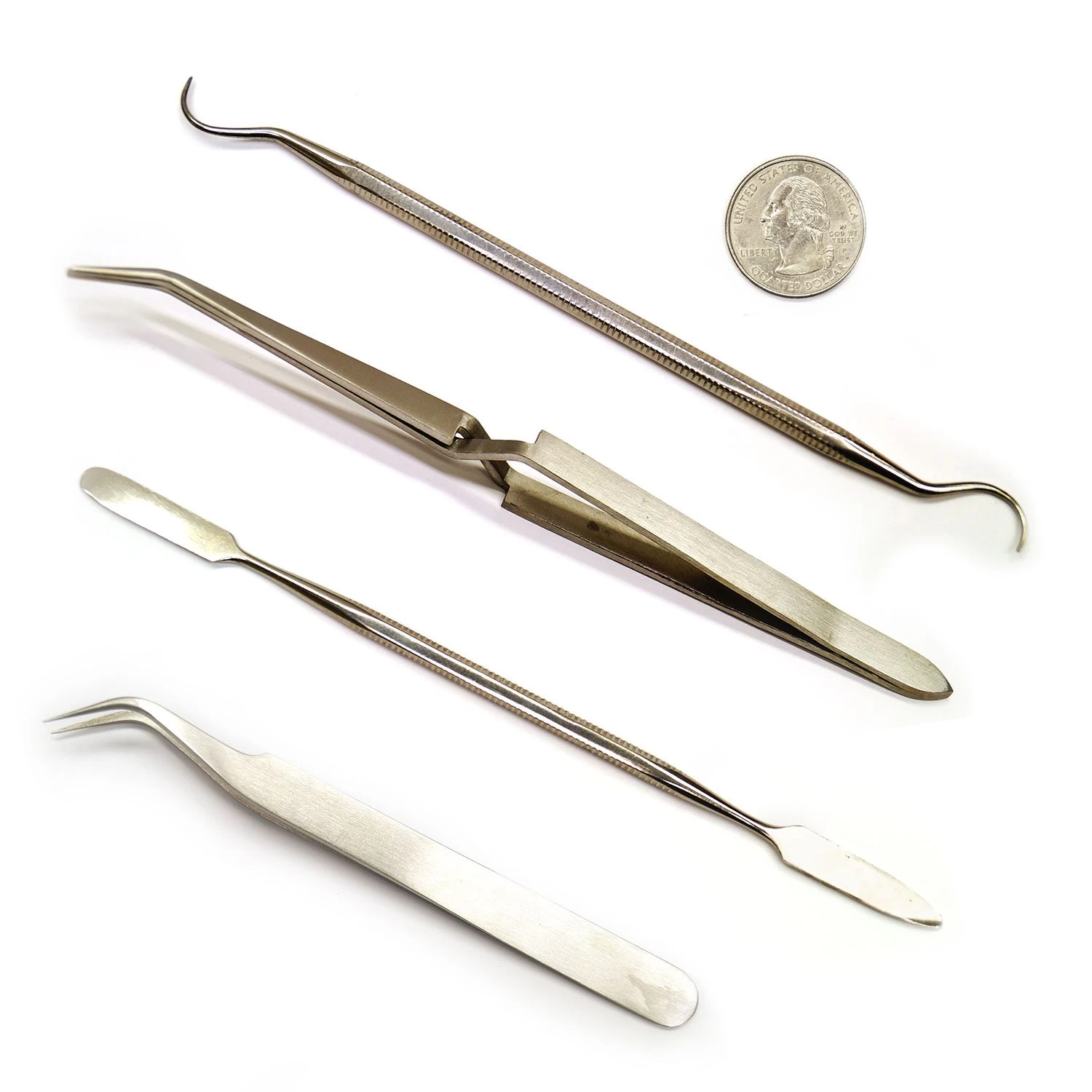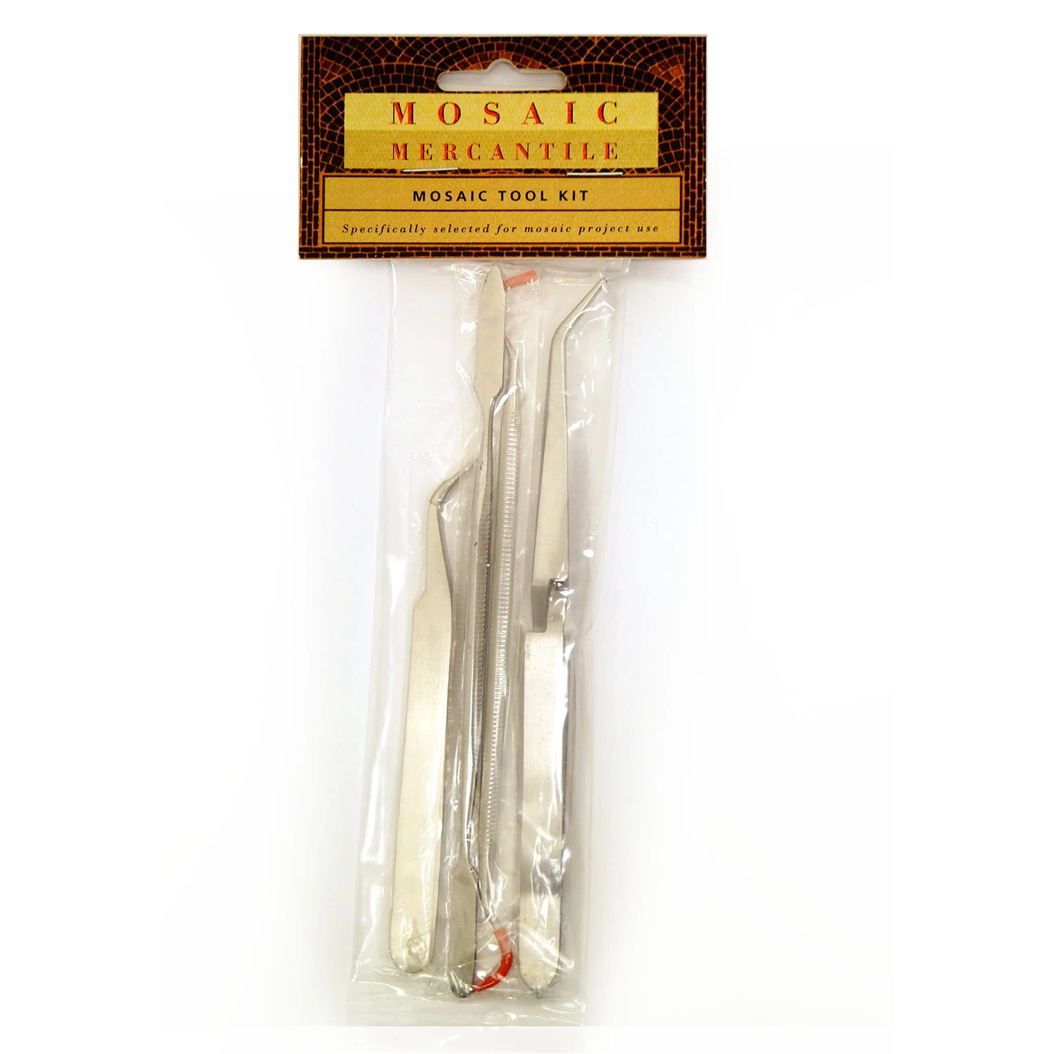 Specifically selected for mosaic project use. We have found these tools to be indispensable for handling smaller mosaic pieces. Includes 4 stainless steel tools: double-sided curved pick, needle nose cross locking tweezers, fine point short tweezer and double ended spatula.