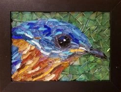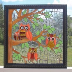 Mosaic bird by artist Arla Allen. Owl glass on glass mosaic by artist Shelly Wood of ARTful Salvage. Both from Delphi’s Online Artist Gallery. Sun mosaic by artist Jen Olsen.