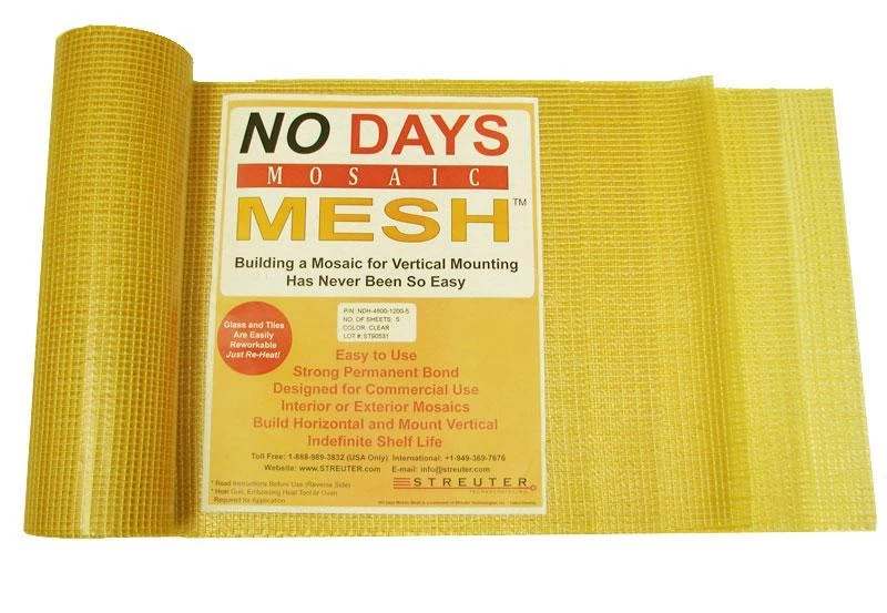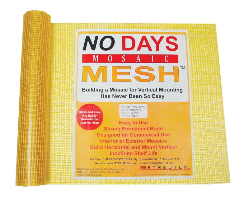 Mesh is conveniently coated with heat activated adhesive, so you can place and reposition pieces with ease. When you’re ready, simply warm mesh with a heat gun to activate adhesive. You can move from layout to installing directly into mastic in minutes, no more waiting! Includes instructions and five 12″ x 48″ sheets.