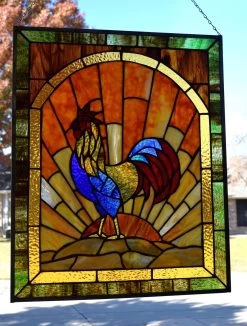 Woven platter created by Nancy Wadelton. Pendant created by Jeanne and Richard Bascom. Rooster created by Olen Cullum. Floral panel created by Bernie Glaster. All from Delphi’s Online Artist Gallery. ‘Grab a Cold One’ by artist Wilma Lotterman, 2021 store Art Glass Festival entry.