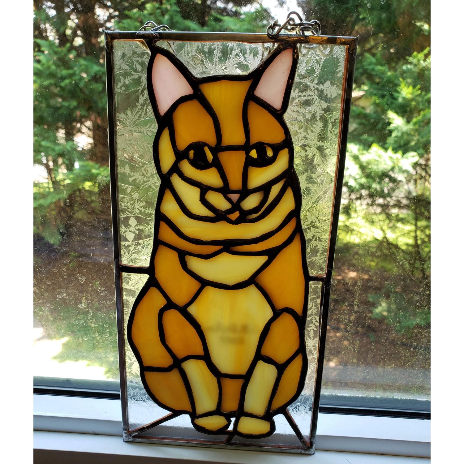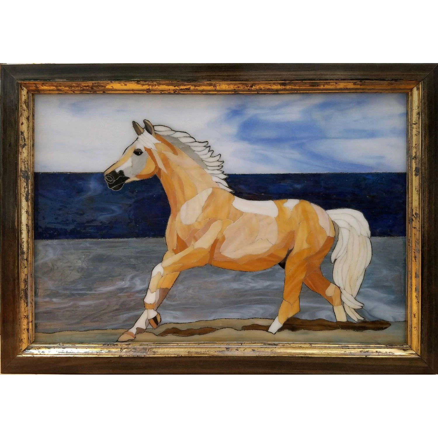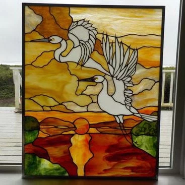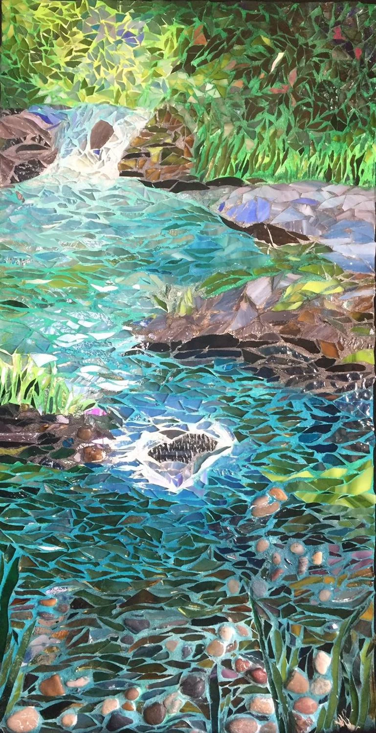 “Waterfall” mosaic by artist Laurel Roush. Horse mosaic by artist John M. Fused soap dish by artist Jayne Smoley. “Chance the Cat” stained glass panel by artist Susan Behm. “White Egrets in Flight” panel by artist Linda Larson. All from Delphi’s Online Artist Gallery.