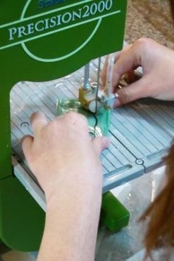 If you’ve been looking for the ultimate do-anything saw, you’ve found it! The Precision 2000 Deluxe Band Saw is driven by a powerful, yet quiet 1/8 hp motor that will make cutting nearly any material a breeze. Equipped with a pre-installed Studio Pro Diamond blade for glass and Lexan plastics you can set up and start cutting in minutes. Switch to the included Studio Pro Wood blade easily with the spring tension mounting system for blades and you’re ready to tackle cuts on wood and composites. This sturdy little saw features a rust-free aluminum frame and plastic body, making it virtually maintenance-free, perfect for the occasional user, hobbyist or weekend warrior. An included rheostat provides adjustable speed control for optimum cutting in any material, and the large water reservoir with recirculating pump will keep you cutting, even on large projects, without frequent water bottle refills. A small footprint and lightweight design offer portability and make it easy to set up and use even in small spaces, all without sacrificing precision and quality. Backed by a full 3 year manufacturer warranty (excluding blades).