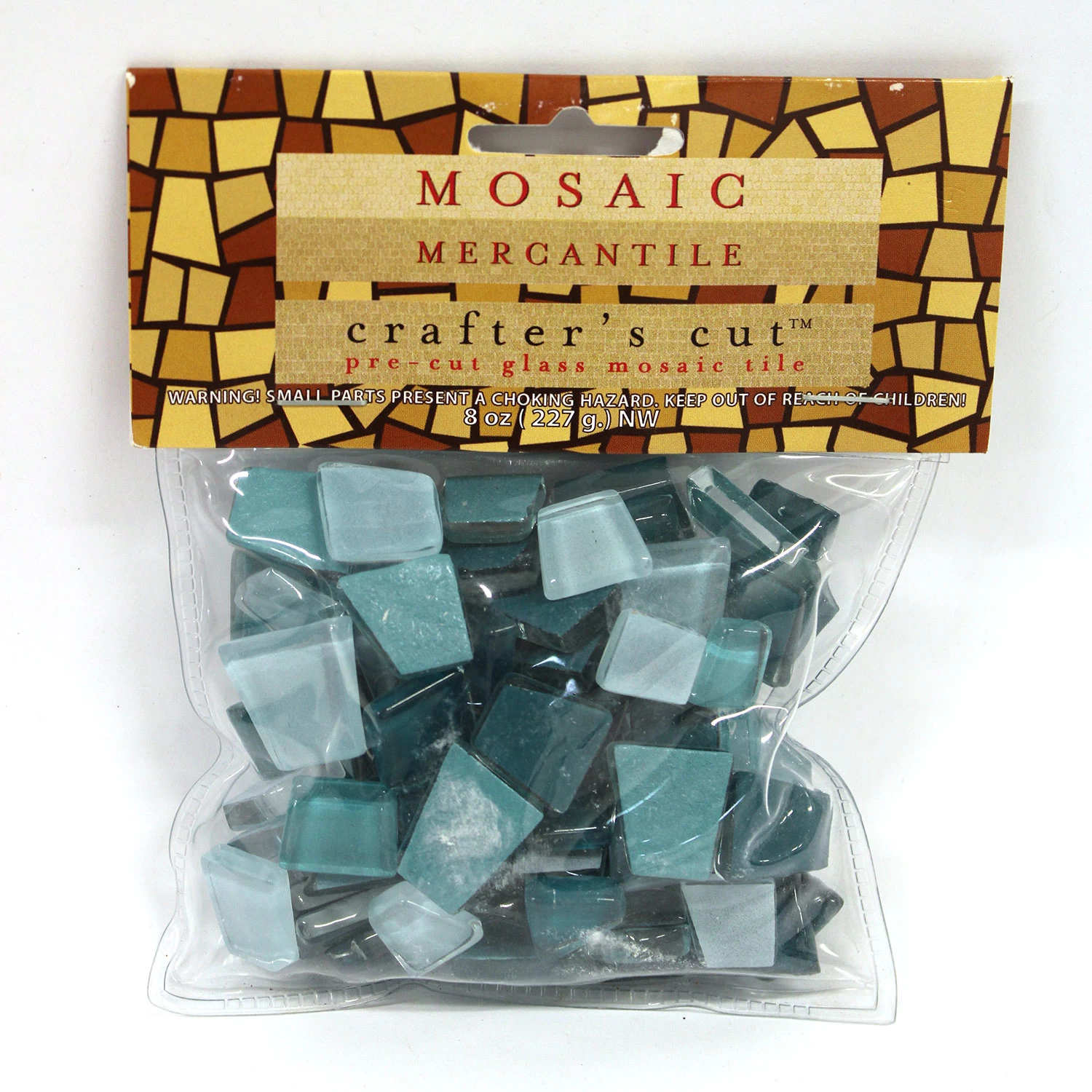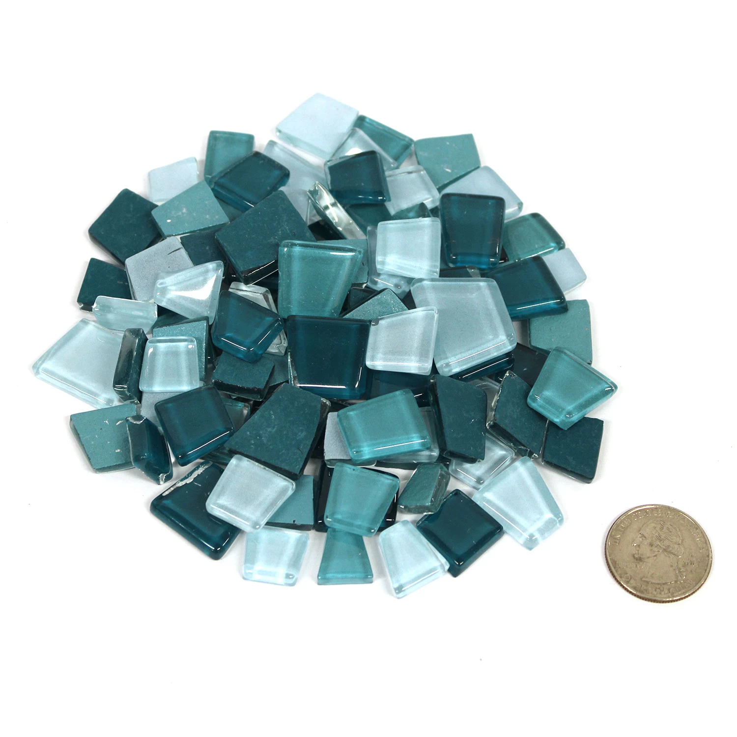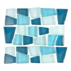 Irregularly shaped teal glass mosaic tiles are designed for easy application. Hand-cut tiles feature painted backsides that allow light to pass through the tiles from the top and sides creating amazing depth. Sizes range from 3/4″ to 3/8″. 1/2 lb bags.