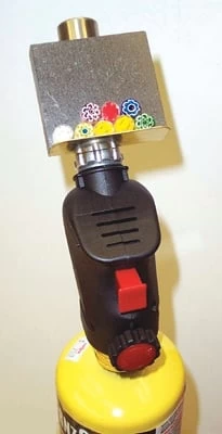 First bead image below from “You Can Make Glass Beads,” book #6233. Second image of beads by Yoshiko Shiiba from “1000 Glass Beads,” book #5988. Delphi Tip: Heat millefiori with a marver, as shown in image below. Fused tray created by Jaime Dobson using Effetre Sheet #521004, millefiori and mold #4213. Please note there are compatibility issues with yellow millefiori.