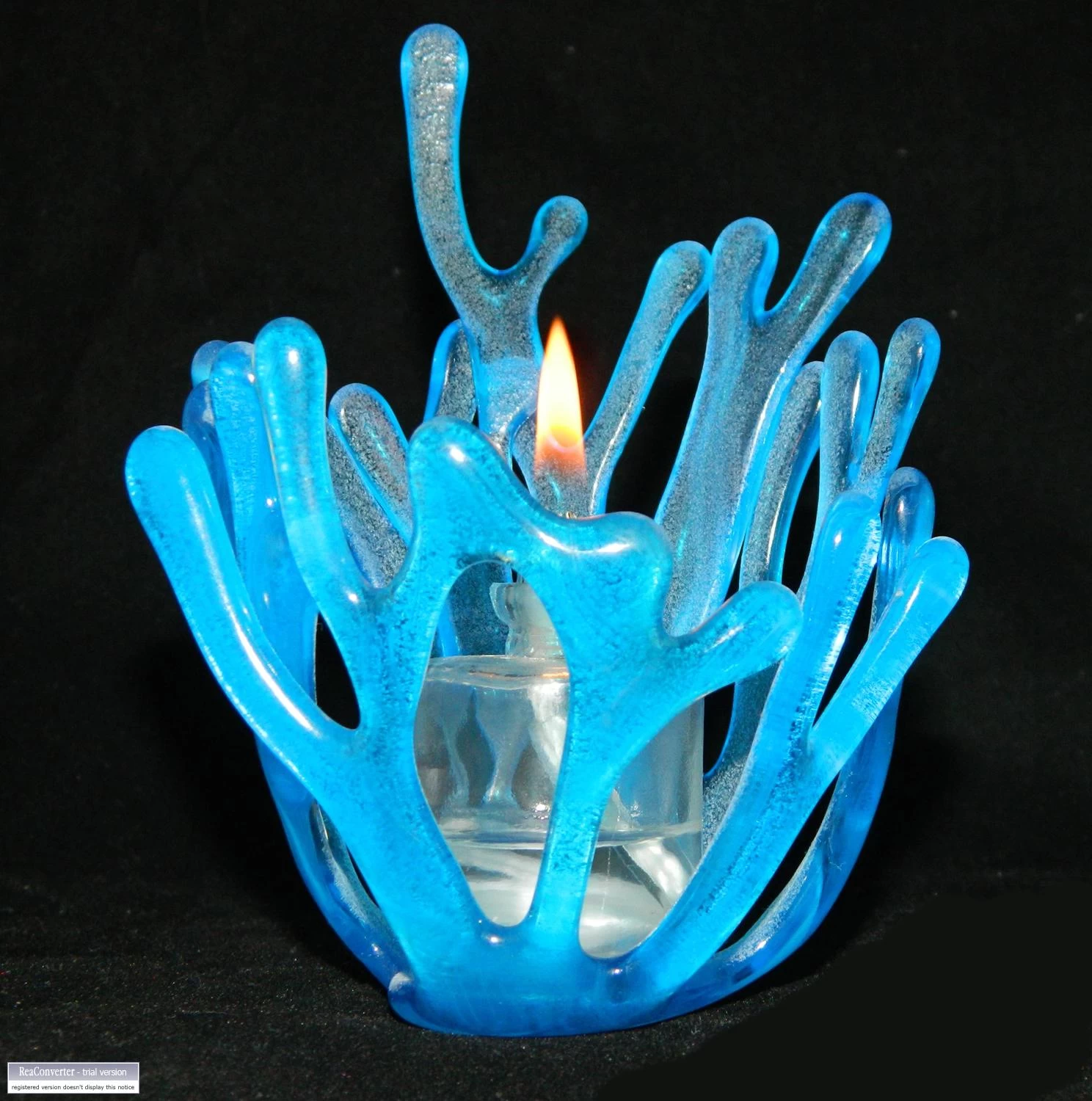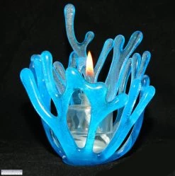 The lovely iridescent draped candle shelters shown here were created by artist Julie Nelson. Coral candle holder created by artist  Mikki Baringer, from Delphi’s Artist Gallery.