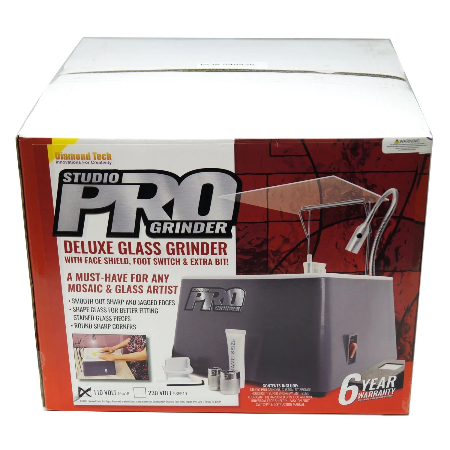 The Studio Pro Deluxe Grinder is the professional grinder at a hobbyist price. Equipped with a 1/8 HP motor and 1/4″, 3/4″ and 1″ Studio Pro Bits, the Studio Pro Deluxe Grinder is powerful enough to keep up with serious glass artisans. Features the Super Sponge water cooling system and a 9-1/2″ x 9-1/2″ easy glide work surface an adjustable light, Easy-On foot switch and Universal Face Shield. Add in the 6 year manufacturer warranty (excludes bits), and this grinder presents a great value for years to come.