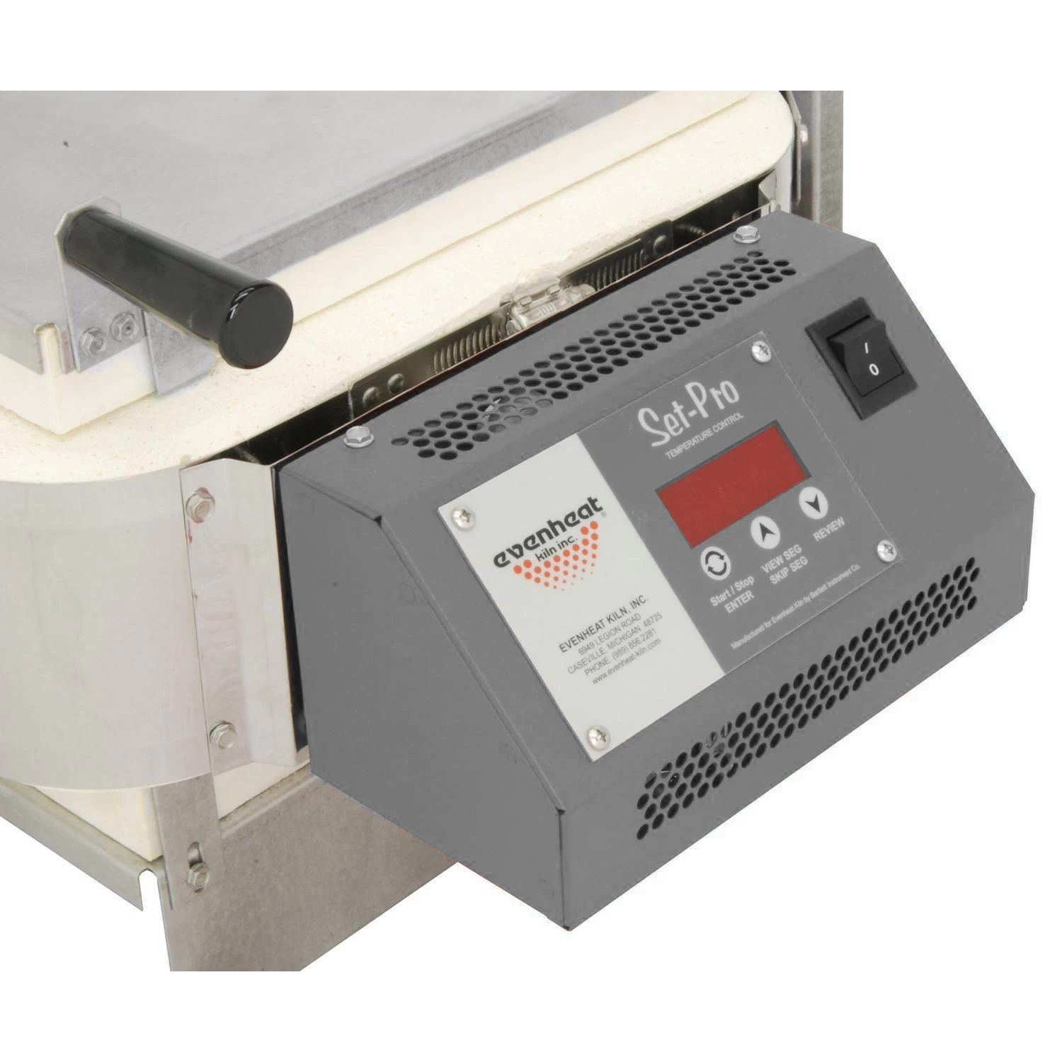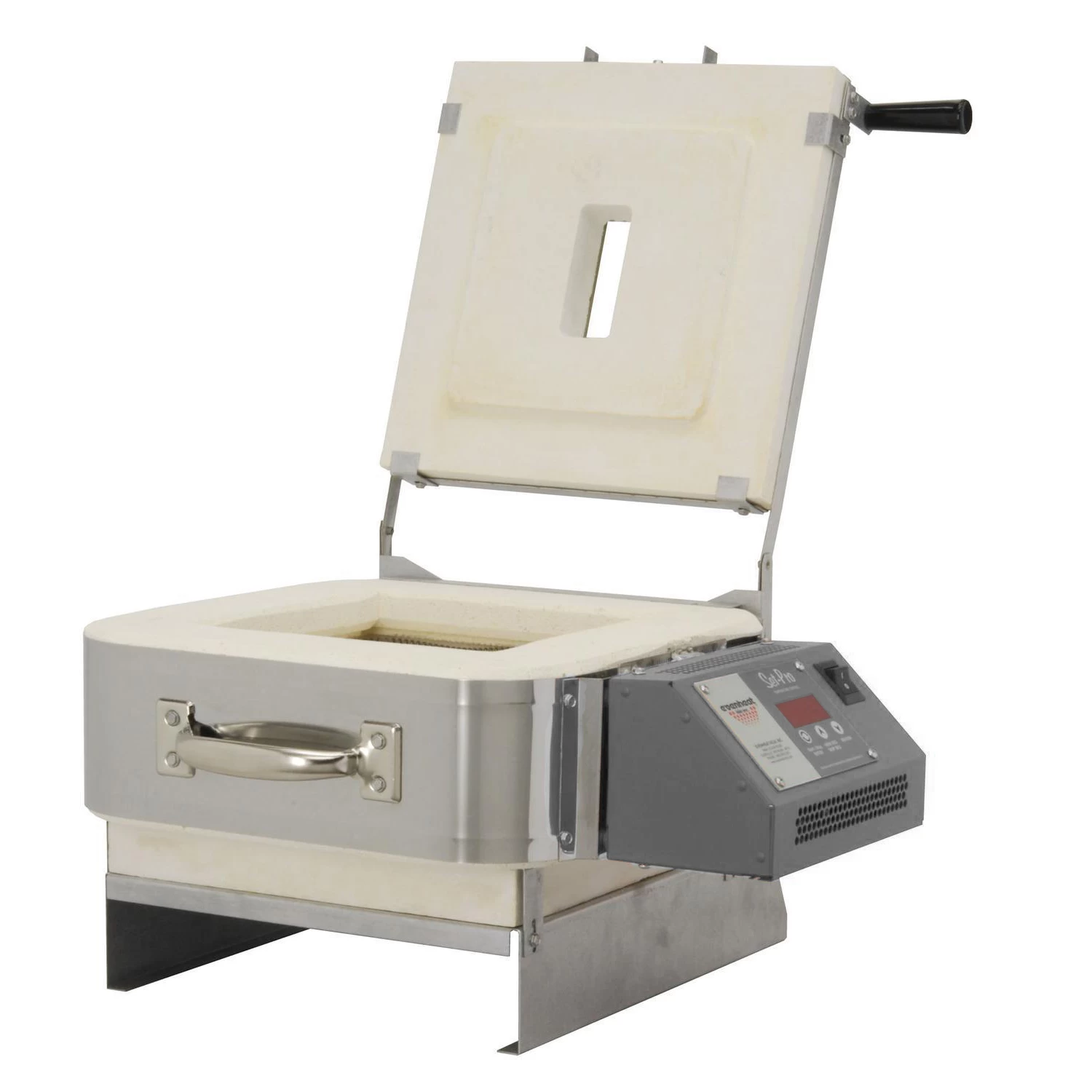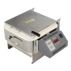 Dual hinged design offers unlimited access to your art. Lid flips up for loading projects, venting, or for manipulating the glass while inside the kiln, while the front-loading option makes loading your kiln easy! Features include sturdy corner mounted handles for easy access to the lid and body of the kiln, and a multi-position lid vent system. Equipped with the 3-button Set-Pro Digital Controller with Express Mode, getting started fusing will be fast and simple. Select your COE, firing type and speed to use one of 48 pre-set programs, or create and store up to 4 custom 8 segment programs of your own. Includes furniture kit; kiln shelf, glass separator and brush. Operates on standard 120v household current. 20 amps. All kilns phase 1. 2 year manufacturer warranty.