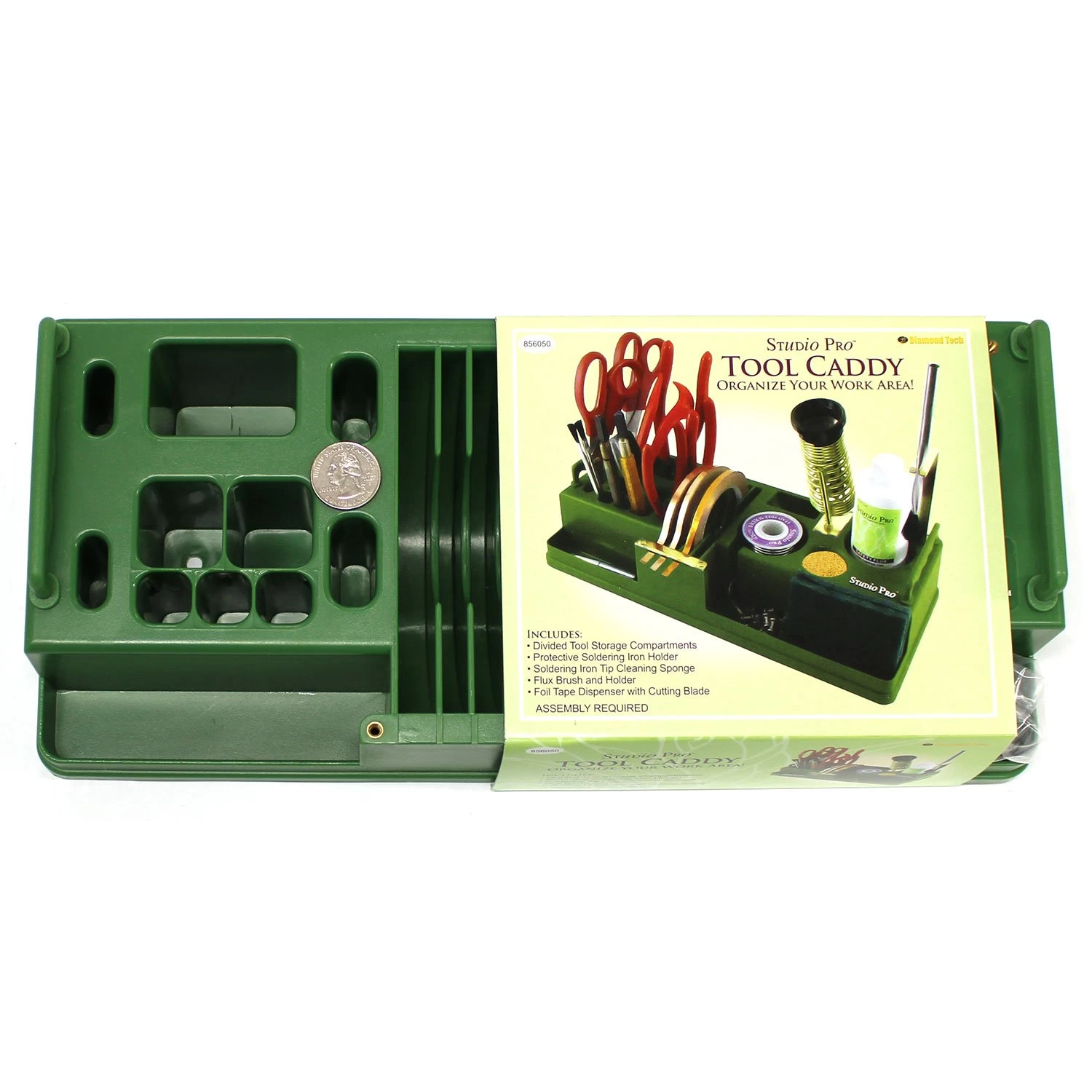 A clean work space is a happy workspace ready for creation! Keep your most used stained glass hand tools ready at hand with the Studio Pro Tool Caddy. This caddy includes a soldering iron stand, sponge receptacle, 4 roll copper foil dispenser with tear blade, and many more spaces for foil shears, flux brushes, pins and more! Pull up handles make caddy easy and convenient transportation. Made from high density ABS plastic for sturdy construction. Some assembly required.