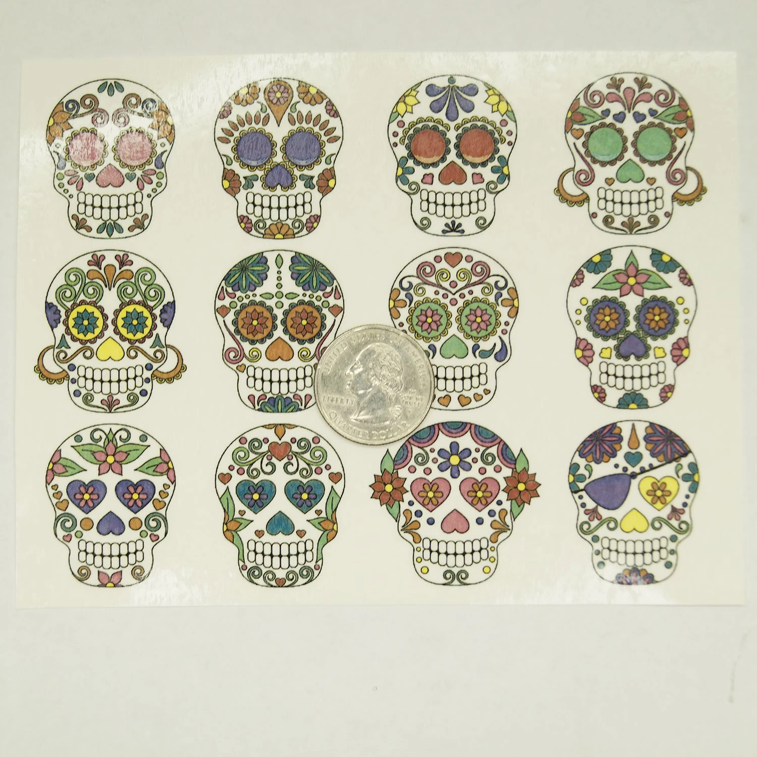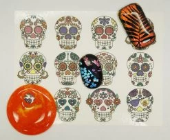 For the price of paper stickers, you can add permanent, colorful detail to your fused designs. Use expressive high-fire decals to make incredible glass art. It’s easy! Simply remove decal from backing, apply to the glass and fire to permanently fuse designs onto glass surface. Fuse Art Decals cannot be torn, scuffed, wrinkled or soaked off the glass surface once fired. Lead-free. Decal sheet measures 3-3/4″ x 5-1/4″ and features 12 skulls measuring 1″ x 1-1/4″ each.