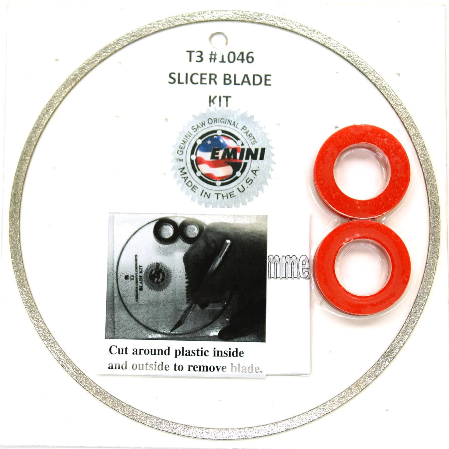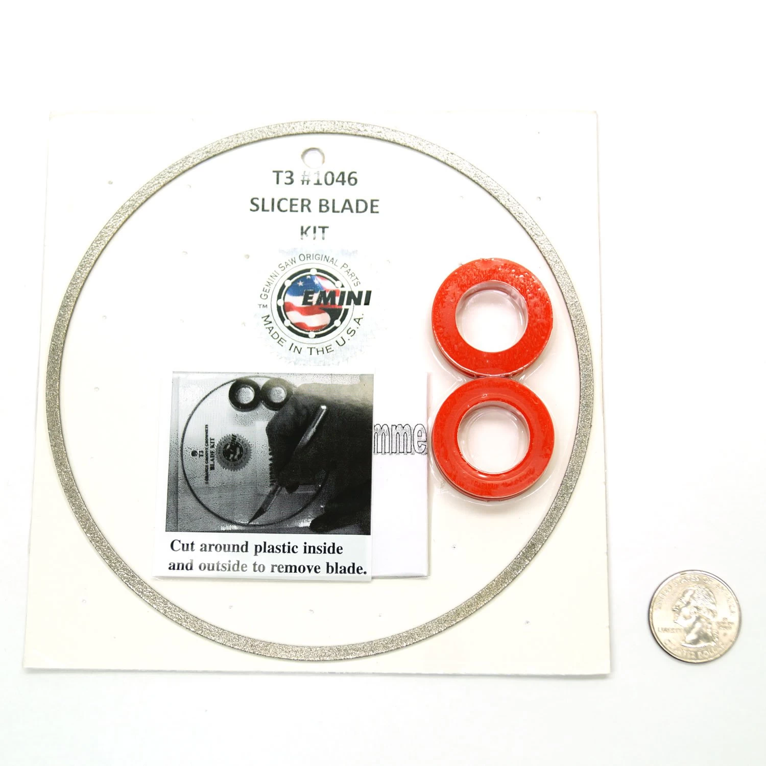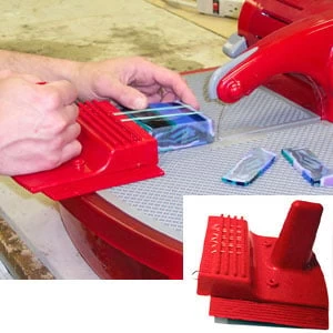 Use with Super Slicer attachment #57108 to cut slab glass, pattern bars, millefiori, streamers, cans, rods and other small objects in perfectly parallel thin slices. Cuts slices as thin as 1/8″. Super Slicer blade only fits the Taurus 3 ring saw #57003. Includes 2 orange grommets.