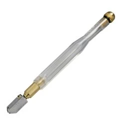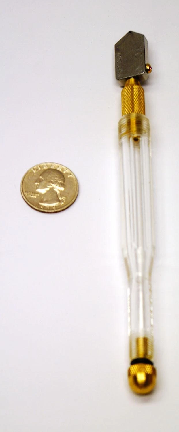 To hold the glass cutter, place your thumb on the backside of the cutting wheel. Place your middle and index fingers on the front, similar to holding a pen. Your thumb and fingers should be positioned just above the cutting wheel. For more control place your free hand in the same position.